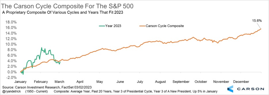 The chart below is based on a Carson proprietary composite for the S&P 500 reviewing various cycles, including the presidential election cycle. The Cycle Composite annual return is 15.6%. As of early March, 2023 is keeping pace with historical trends, i.e., a return of about 4%.