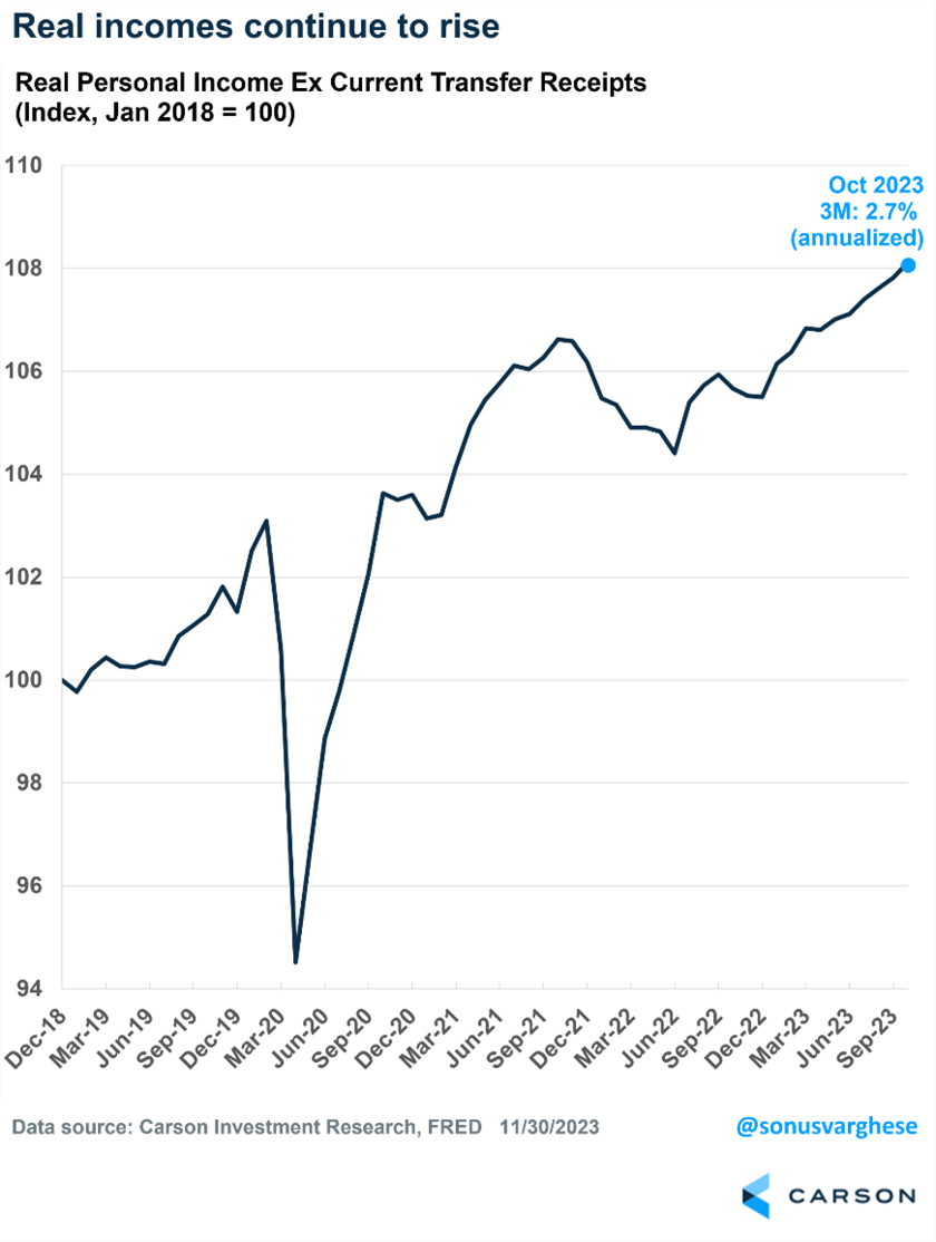 Lastly, the employment backdrop remains very strong. In fact, another 199,000 jobs were added in November, above expectations for approximately 180,000. Workers returning after the end of the autoworkers and Hollywood strikes provided a boost, but the three-month average is a 204,000 gain. For perspective, job growth averaged 163,000 a month in 2019. The economy needs about 100,000-125,000 net new jobs a month to keep up with population growth.